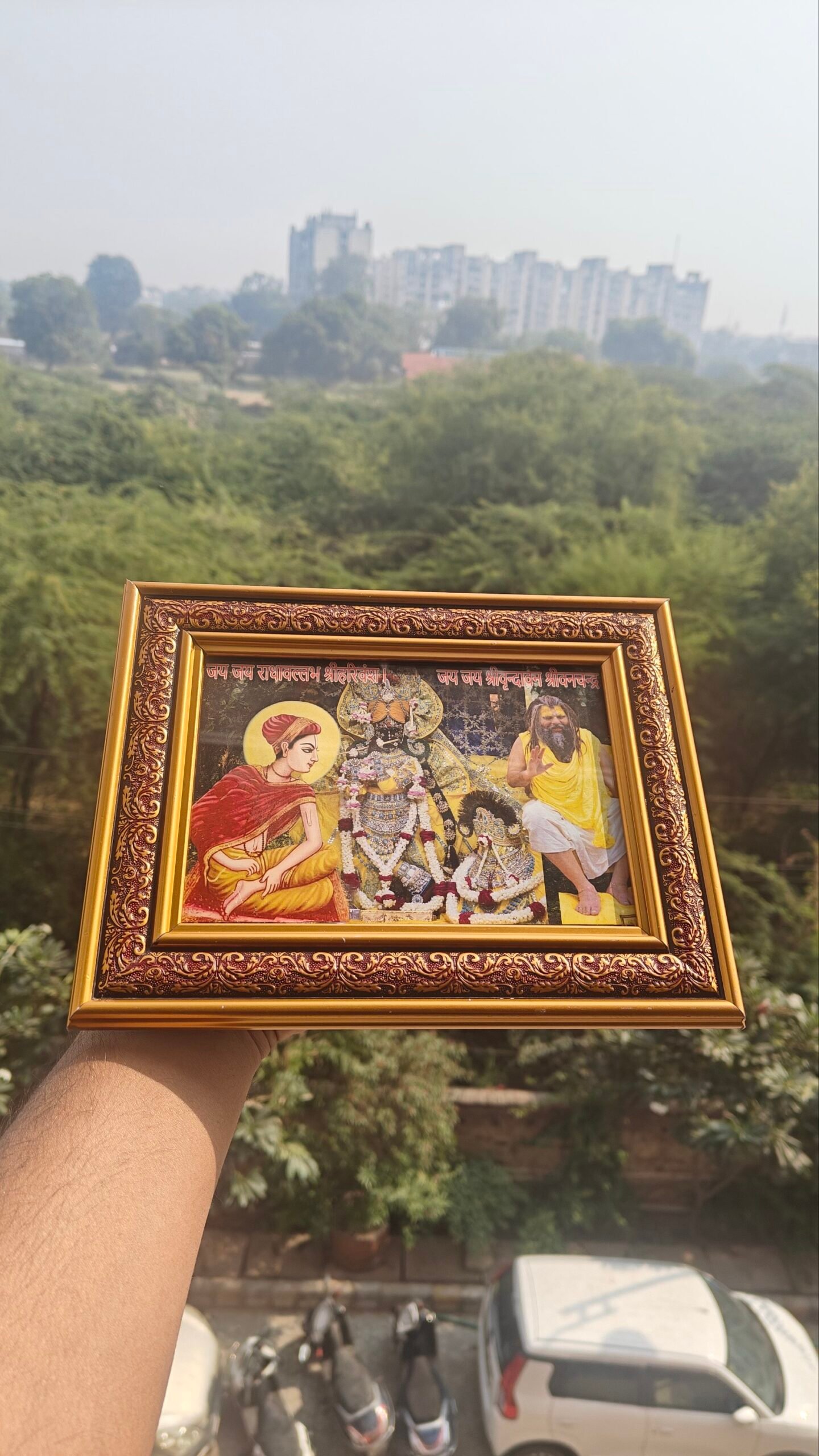 Keli Kunj Diksha Frame featuring Shri Harivansh Mahaprabhu, Shri Premanand Ji Maharaj, and Shri Radhavallabh Ji in one sacred frame. This divine frame symbolizes guru-kripa, bhakti, and the eternal Radha-Vallabh tradition. Ideal for home temple, pooja room, ashram, or gifting to Harivanshi devotees. Crafted with premium quality printing and durable framing for long-lasting spiritual presence.
