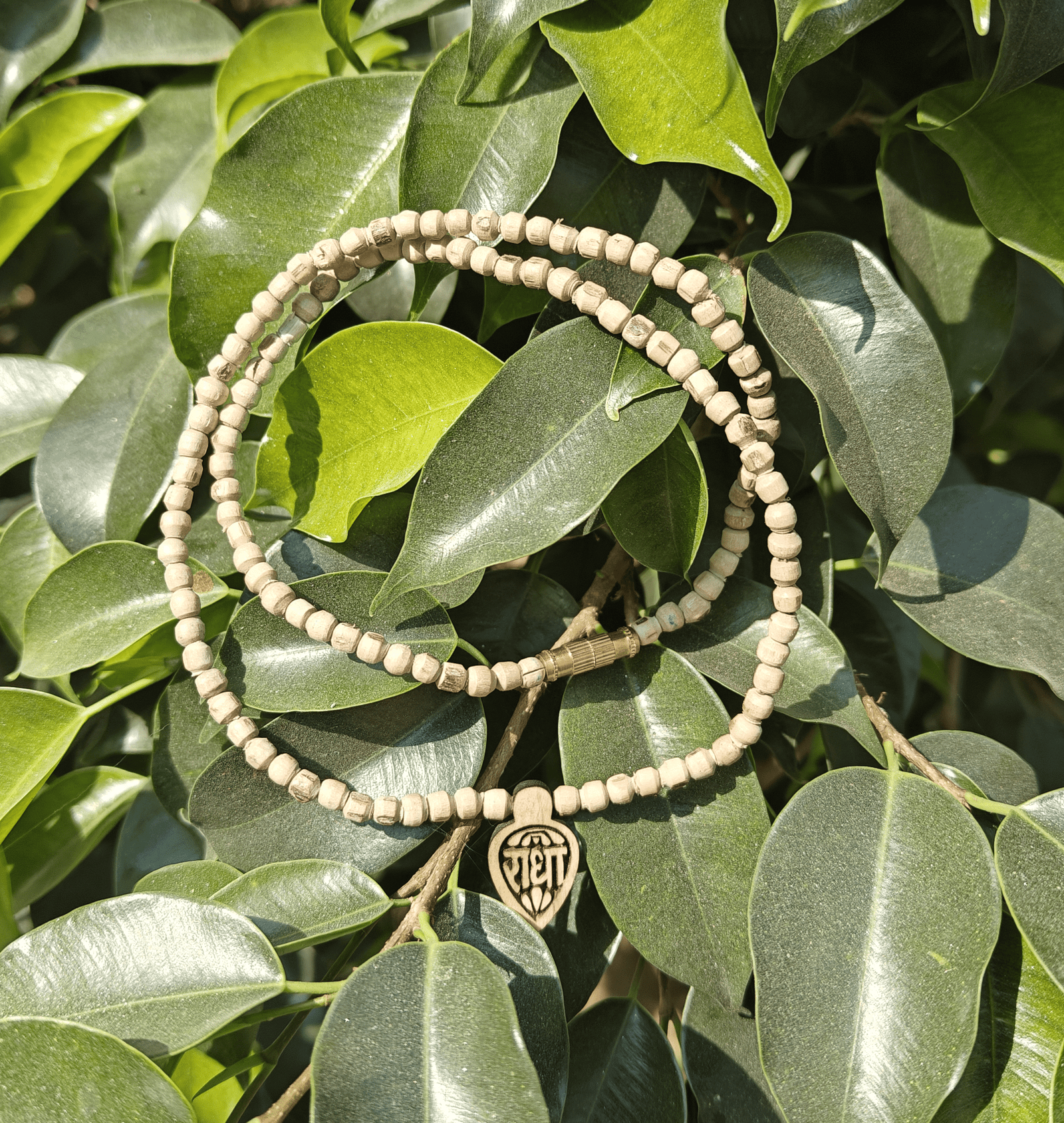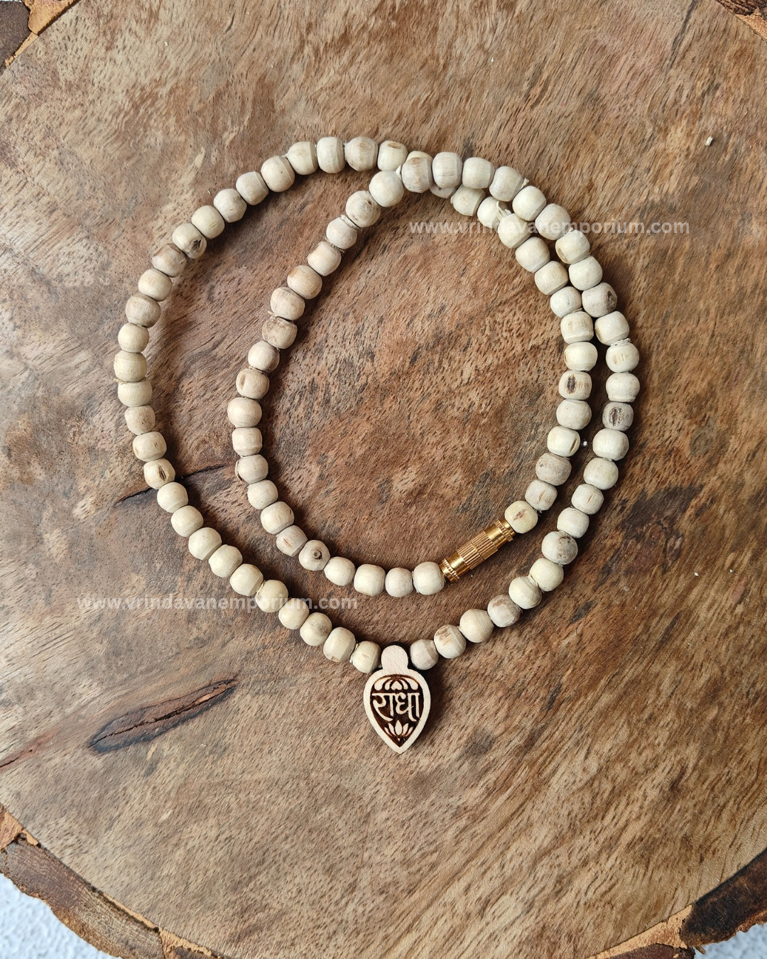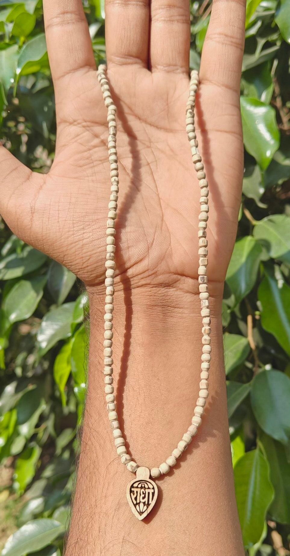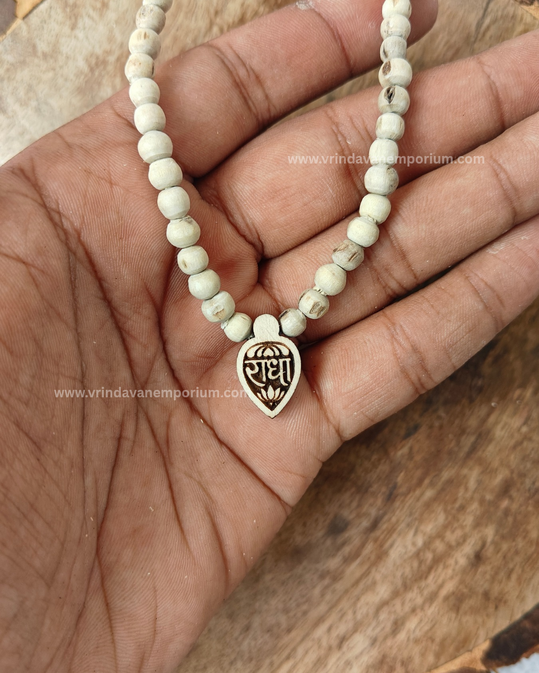 Each bead in this Kanthi Mala is carefully handpicked and strung together with precision. The beautiful locket, engraved with “Radha Naam,” adds a special divine touch, making it a symbol of pure love and faith. Tulsi wood is believed to absorb negative energy, bring spiritual protection, and create a sense of divine bliss. Devotees often wear this mala during prayers, meditation, and chanting, feeling its soothing and uplifting vibrations.