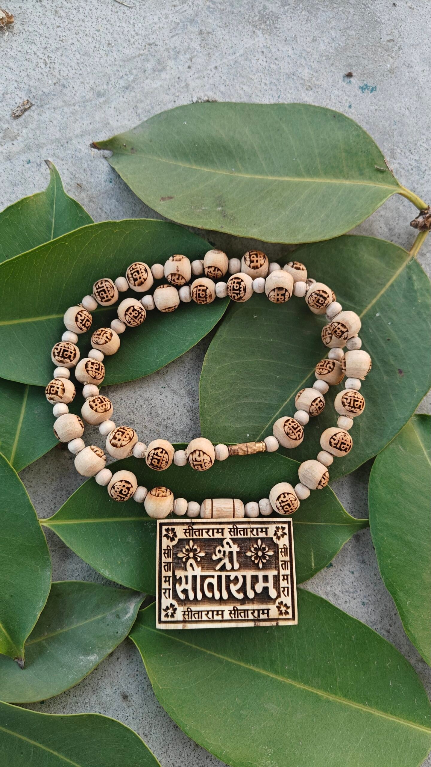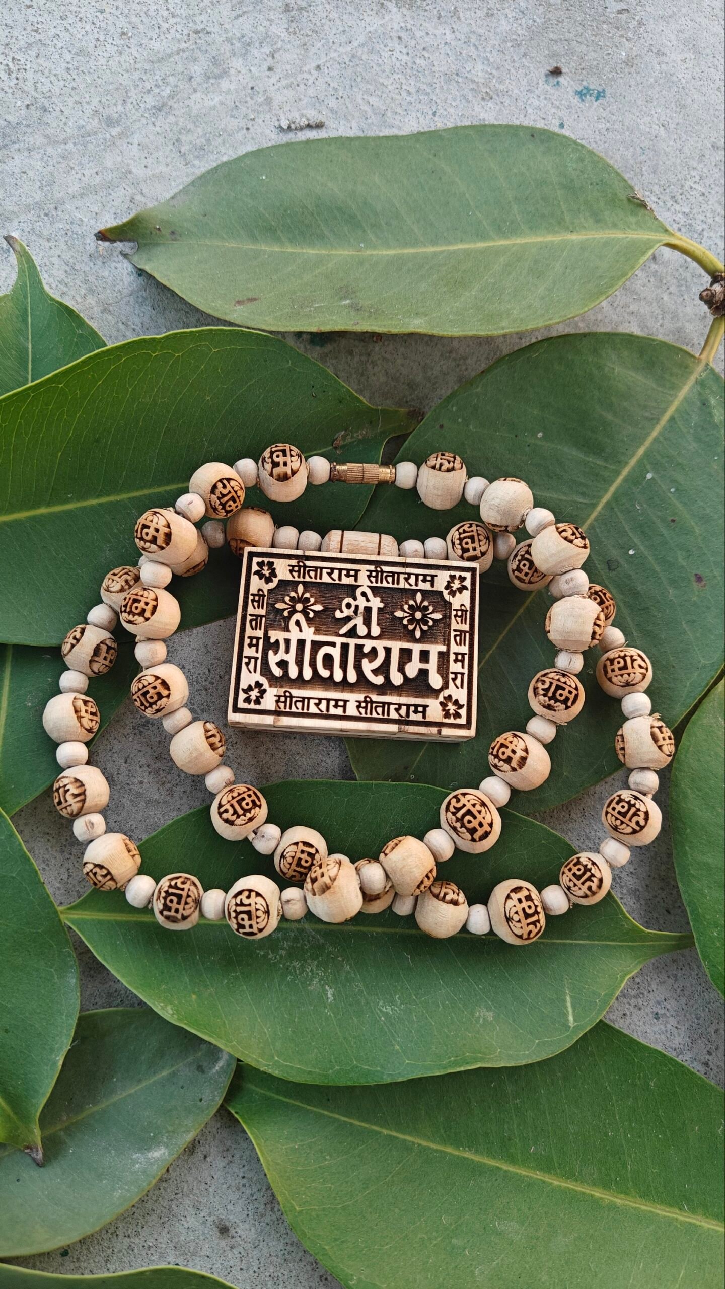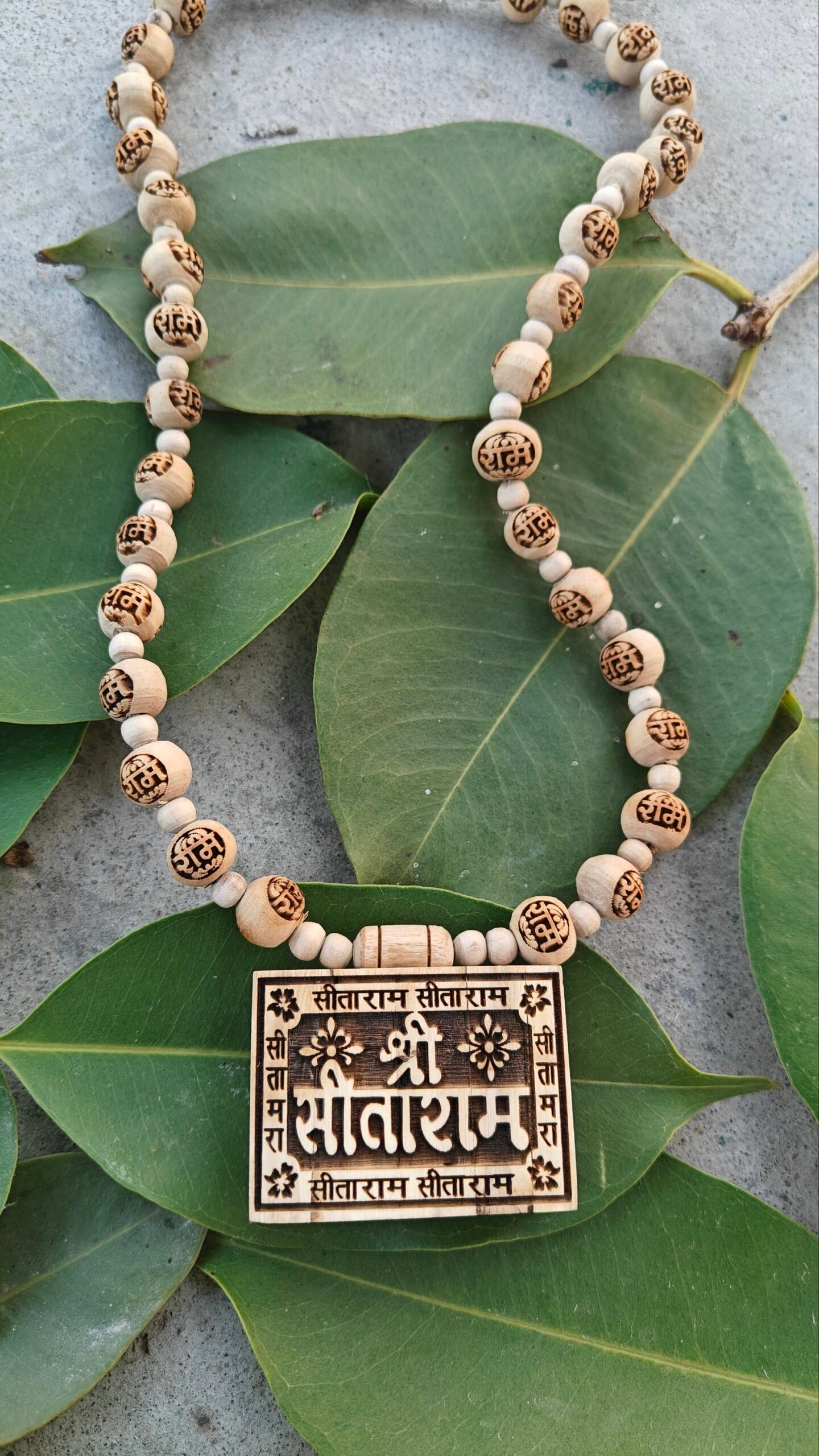 Shri Sitaram Tulsi Bhaktmal with Ram Naam Beads is a sacred keepsake that brings together the divine energy of Tulsi wood and the spiritual essence of Shri Ram Naam. The bhaktmal features intricately carved Shri Sitaram on a pure Tulsi pendant, accompanied by authentic Tulsi beads inscribed with the holy name “राम” (Ram) on each bead. Perfect for daily japa, meditation, or as a powerful spiritual accessory, this mala radiates devotion and peace.